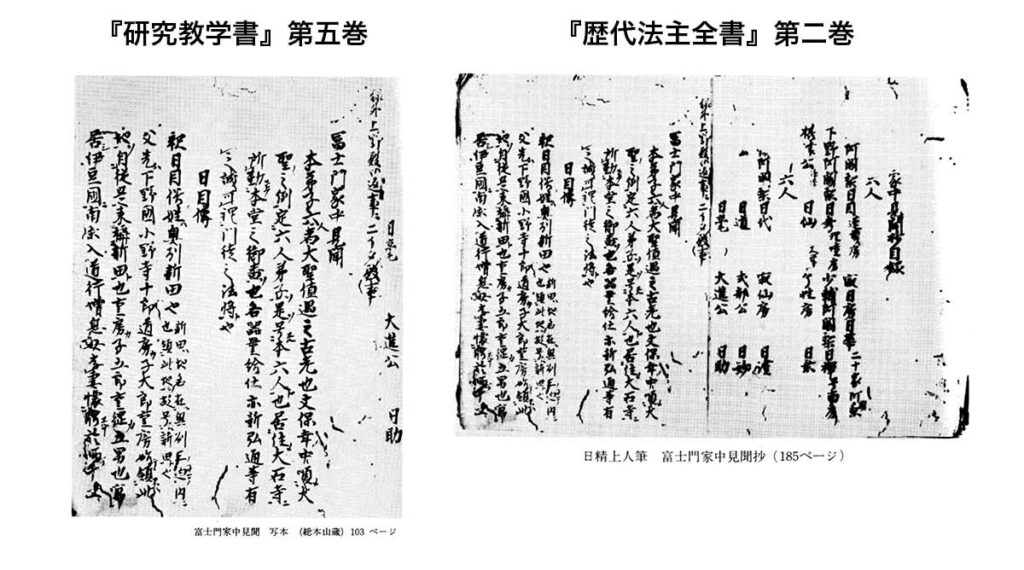 左が『研究教学書』の巻頭図版、右が『歴代法主全書』の巻頭図版である。同本(大石寺所蔵本)であるにもかかわらず、『研究教学書』には「写本」、『歴代法主全書』には「日精上人筆」とある。